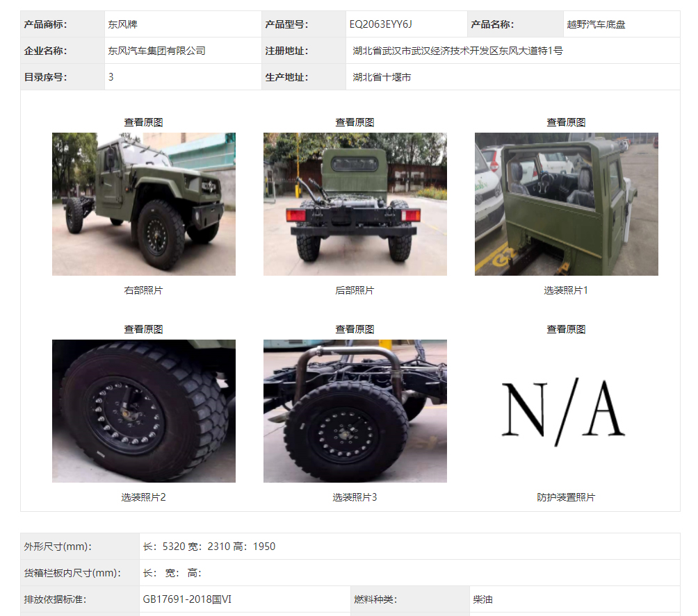 東風(fēng)猛士民用版EQ2063EYY6J型四驅(qū)越野汽車底盤在340批次公告中公示成功