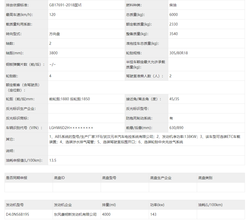 東風(fēng)猛士民用版EQ2063EYY6J型長(zhǎng)頭單排四驅(qū)越野底盤其它參數(shù):1、ABS系統(tǒng)的型號(hào)/生產(chǎn)廠家:YF8/武漢元豐汽車電控系統(tǒng)有限公司;2、發(fā)動(dòng)機(jī)凈功率:138KW;3、該車型可選裝ETC車載裝置;4、選裝涉水排氣尾管;5、選裝駕駛室后圍開口;6、選裝輪胎中央充放氣系統(tǒng);7、排放依據(jù)標(biāo)準(zhǔn):GB17691-2018國(guó)Ⅵ。