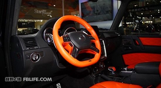 北京車展上的基于G63 AMG 6×6改裝而來(lái)的BRABUS 版700G 6 X 6 內(nèi)飾方面,該車采用了黑色和橘黃色的顏色搭配,強(qiáng)烈的顏色反差構(gòu)造出不錯(cuò)的視覺效果。四幅式真皮方向盤外圈也采用橘黃色真皮包裹,搭配顏色裝飾條,視覺效果極佳。擋把的設(shè)計(jì)類似于飛機(jī)操作感,上面印有巴博斯的標(biāo)志,非常具有設(shè)計(jì)感。