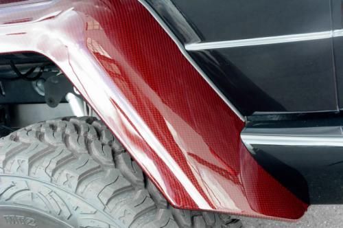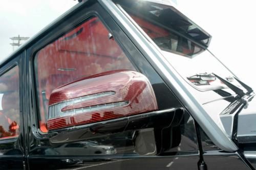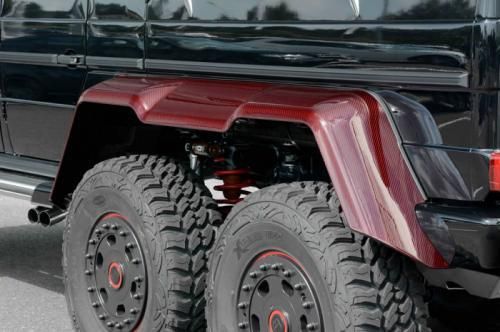 第一眼看去,這輛G63 AMG 6x6的涂裝會(huì)讓人感覺(jué)有些怪異。的確,這輛Brabus出品的六輪怪獸換上了紅色碳纖維車(chē)身改裝件,后視鏡蓋、輪眉以及引擎蓋都采用了紅色碳纖維材料。透過(guò)車(chē)窗我們能看到內(nèi)飾同樣是紅色主題,甚至是輪圈內(nèi)也有紅色點(diǎn)綴。