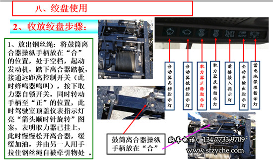 1、放出鋼絲繩:將鼓筒離合器操縱手柄放在“合”的位置,變速器處于空檔,起動發(fā)動機,踏下離合器踏板,接通遠(yuǎn)距離控制開關(guān)(此時蜂鳴器鳴叫),按下取力器自鎖開關(guān),同時轉(zhuǎn)動手柄至“正”的位置,此時駕駛室頂蓋儀表指示燈亮“箭頭順時針旋轉(zhuǎn)”圖案,表明取力器已掛上,此時慢慢松開離合器,緩緩加油,并由另一人用手拉住鋼絲繩自被牽引物處 。
