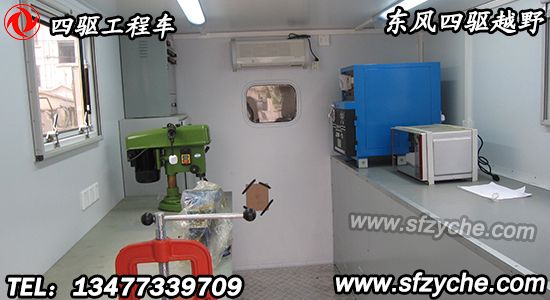 廂體頂部封閉,不可開啟?膳溲b功率相當、其他型號的發(fā)電機組。駕駛室前方安裝電動絞盤、廂體前部安裝備胎和可升降照明裝置、廂體內(nèi)部安裝有發(fā)電機組、電焊機、線纜盤、臺虎鉗、切割機、工作臺等維修工具。側(cè)防護、后防護與車輛均采用焊接連接,材料均為:Q235,后防護斷面尺寸(mm):100×60, 離地高度:500 mm.